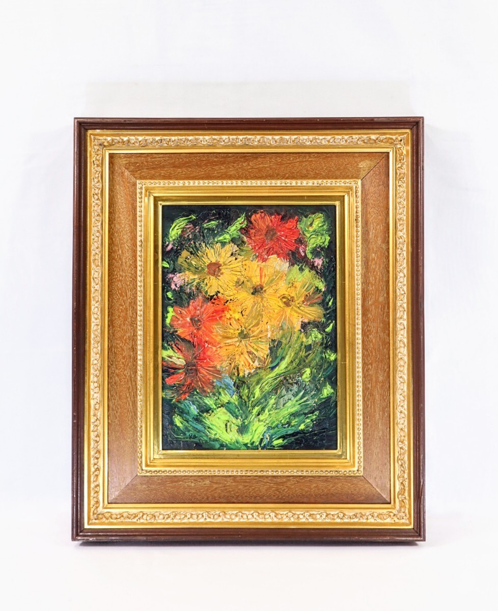 - 真作 片柳忠男 油彩「野に咲く花」画寸 F4 栃木県出身 TVプロデューサー 一陽会委員 豊かな色使い力強い筆致 生命力や自然美を感じる 10623
