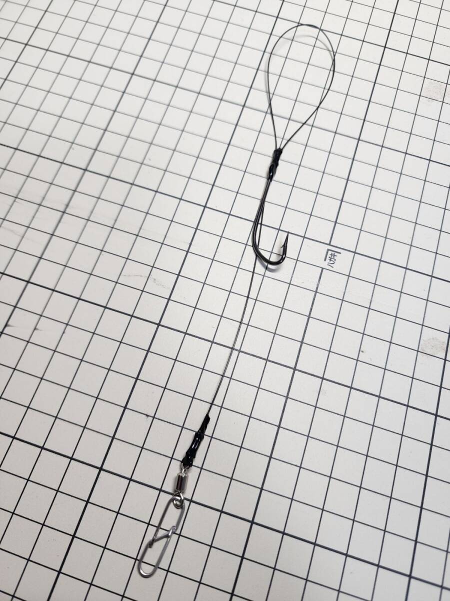 餌針は赤エビ1匹掛け用に大型の軸太針をスリーブ圧着しています。