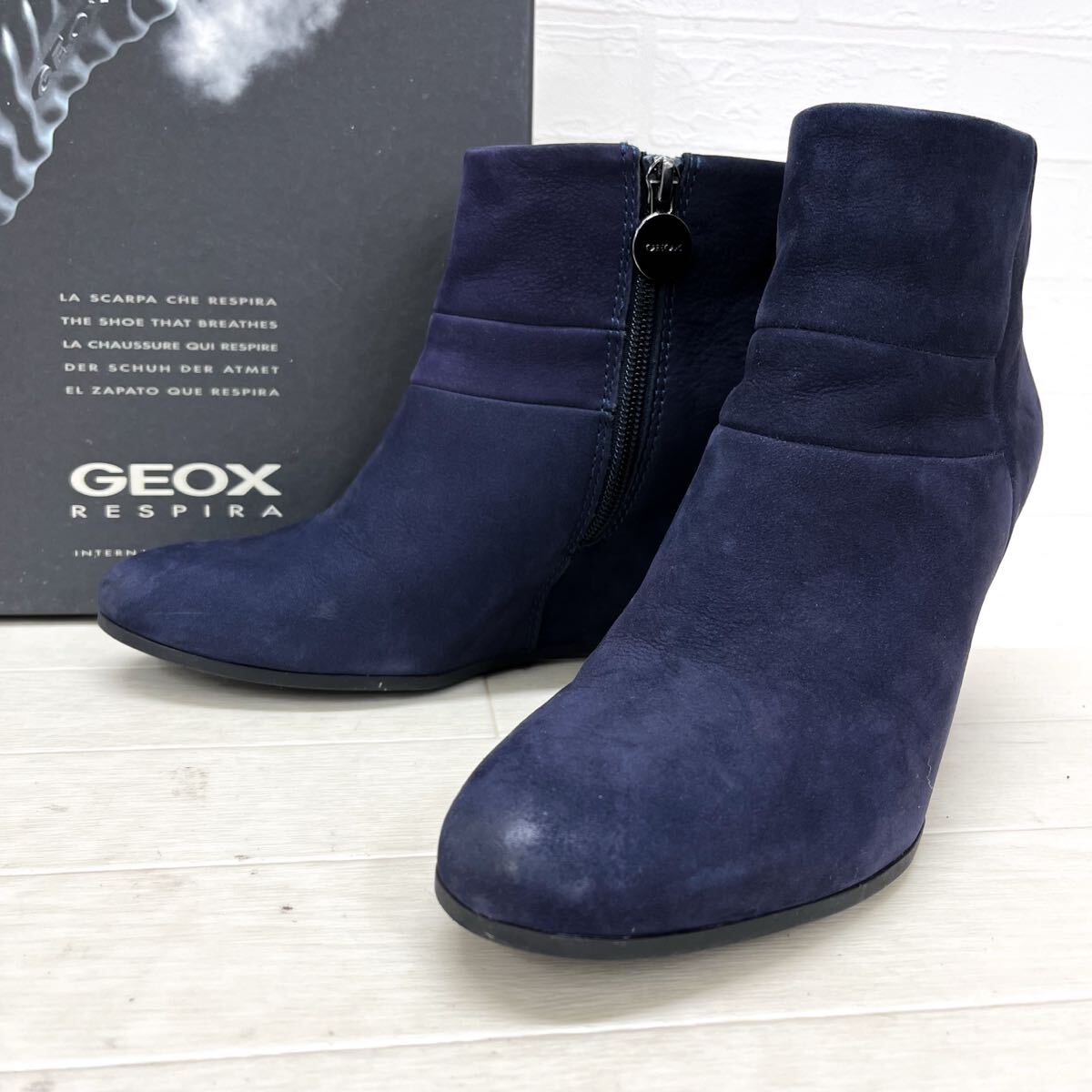 - 和705★ 箱付 GEOX RESPIRA ジェオックス レスピラ ショートブーツ ウェッジヒール サイドジップ 38 ネイビー レディース