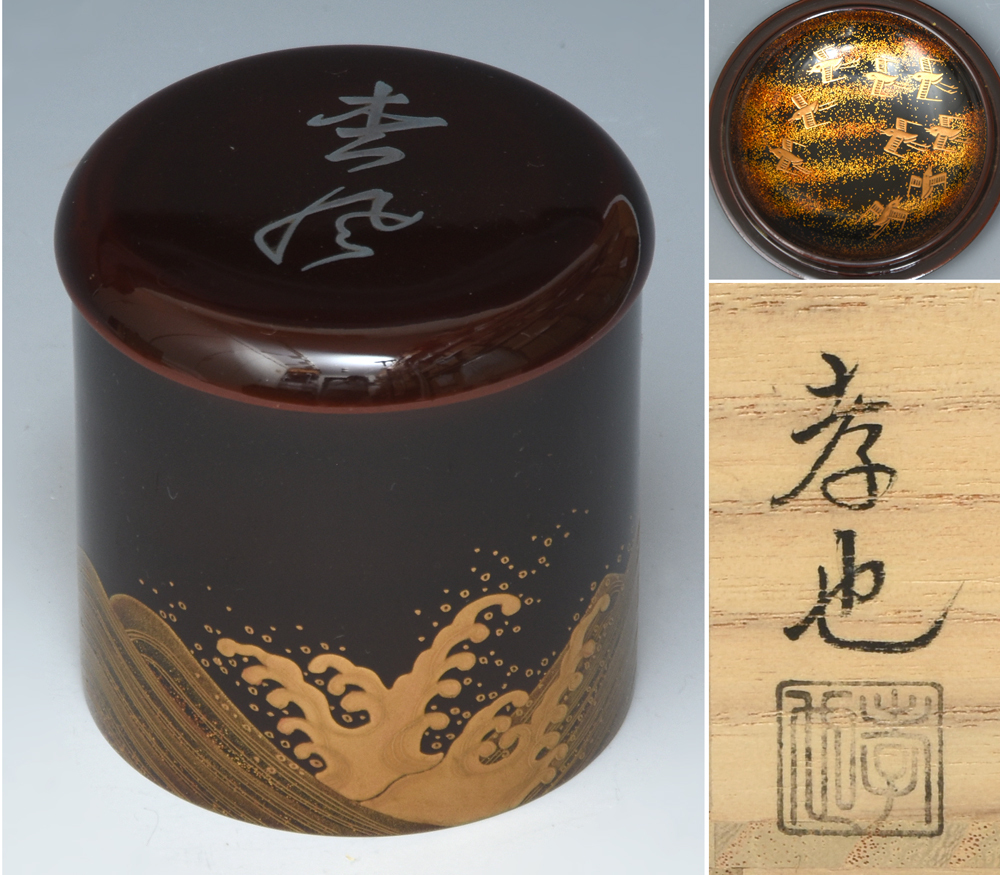 - 中村孝也(造)圓能斎好写 汐汲蒔絵 寸切 棗「松風」共箱 茶道具 木工芸 漆工芸 漆芸 z9367o