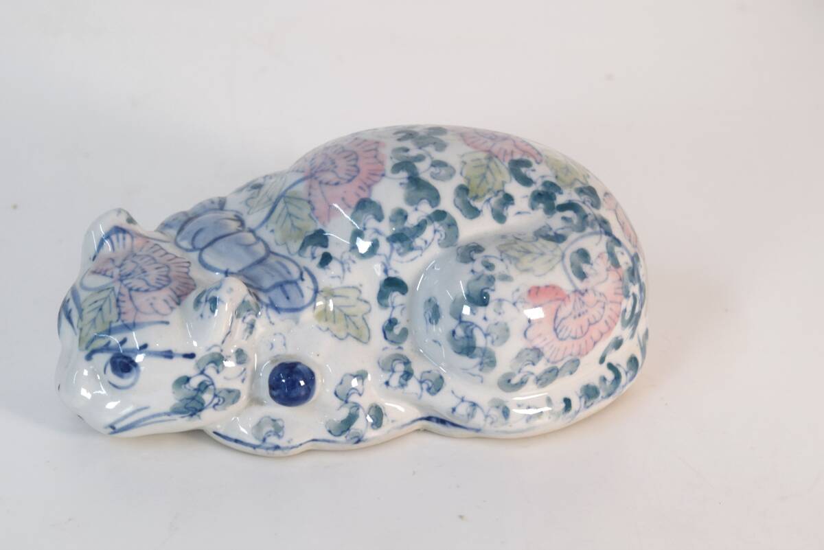 - ■ 染付 花文様 眠り猫 ねこ置物 縁起物 インテリア ■