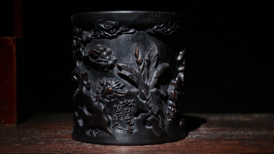 - ▽鴻▽ 烏木製 細密彫 松蔭高士紋 筆筒 置物 古賞物 中国古玩 中国古美術