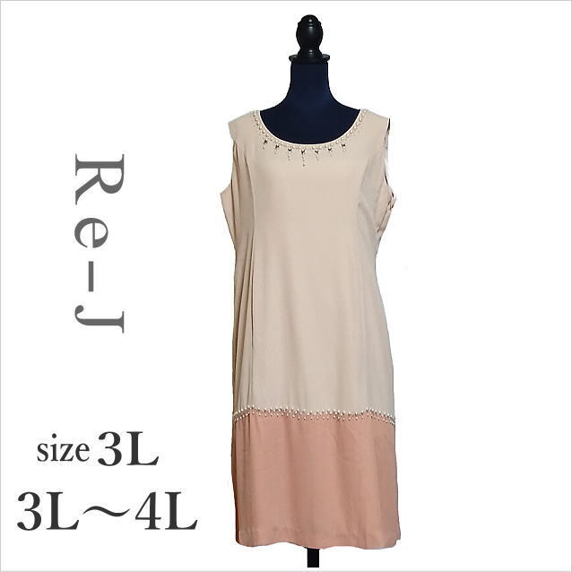 > [Re-J]ベージュ配色ビジュー付きワンピース リジェイ ドレス ミモレ丈 ミディアム丈 フォーマル ゆったりサイズ 3L~4L位 ☆送料込み