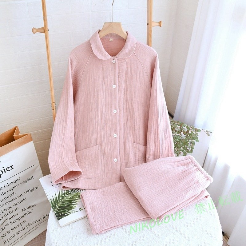 - ☆新品 ガーゼパジャマ ルームウェア L 4重ガーゼ綿長袖前開きコットン入院上下セット オールシーズン快適柔らかい ピンク MK512