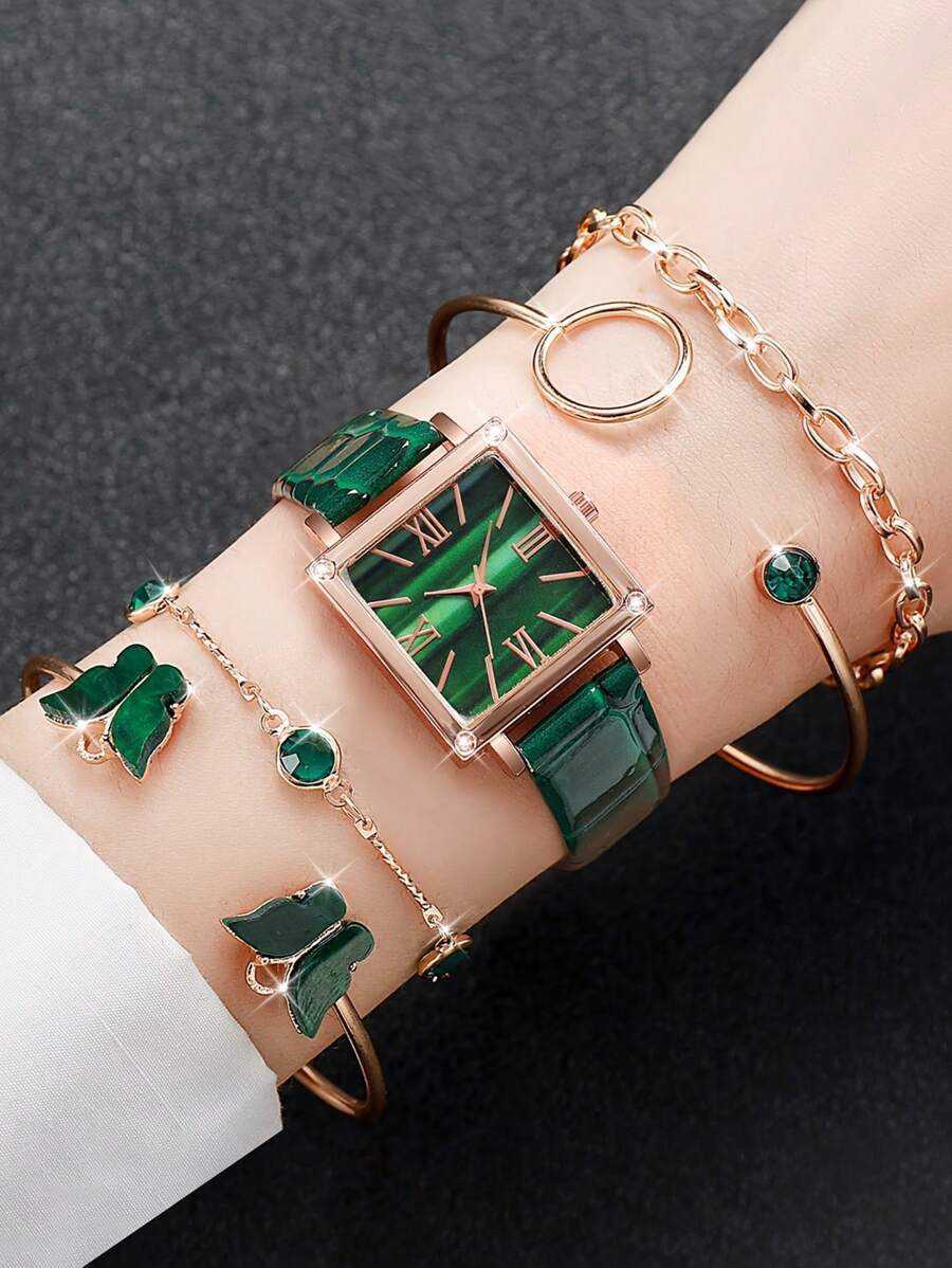 - 腕時計 レディース セット 5点セット レディース腕時計、ファッショナブルでラグジュアリーな緑のPUストラップ スクエア型ケース、