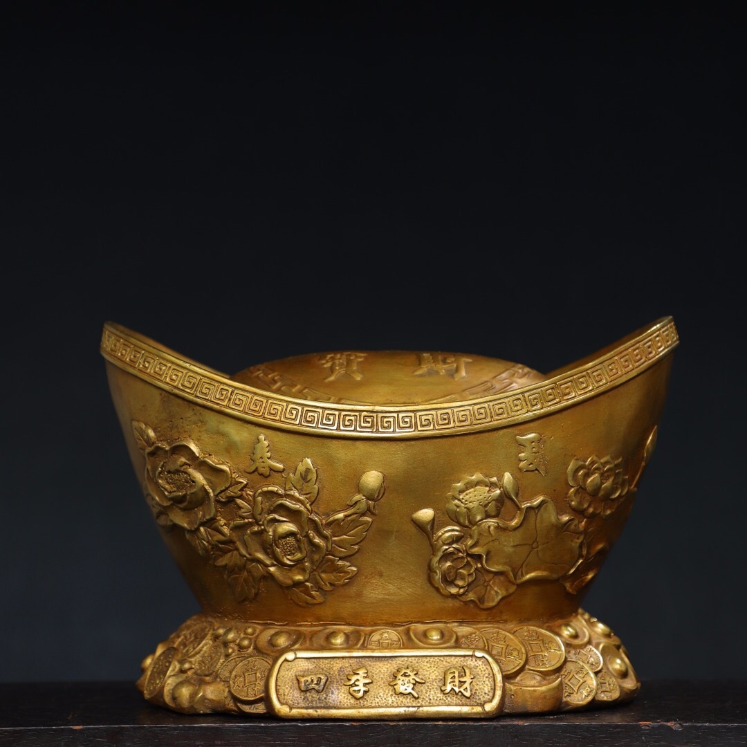 - ▽鴻▽ 銅製 塗金 四季發財元寶 置物 古賞物 中国古玩 中国古美術