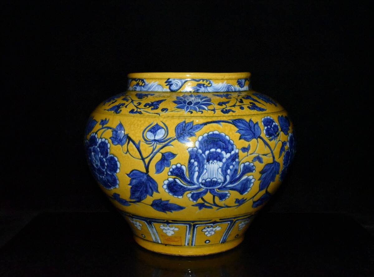 - ▽鴻▽ 元 波斯文 黄釉 青花 纏枝牡丹紋罐 古陶瓷品 置物 古賞物 中国古玩 中国古美術