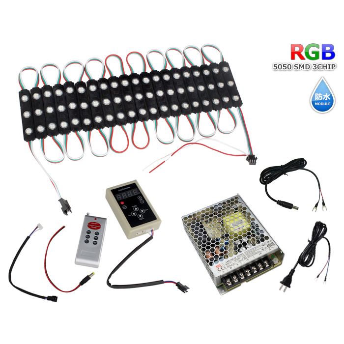 > LEDモジュール 流れる RGB 12V 黒ベース 防水 看板照明 間接照明 内照アクリル 20連×8 コントローラー 電源 セット
