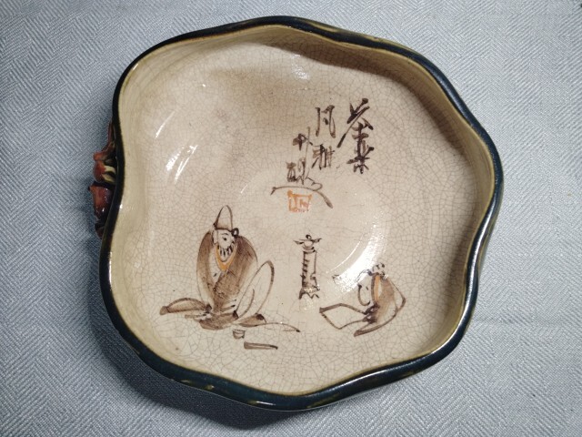 - 織部焼 菓子皿 蟹乗せ 17x5cm 緑風園 朱色あり絵鉢 底裏飛び鉋みたい