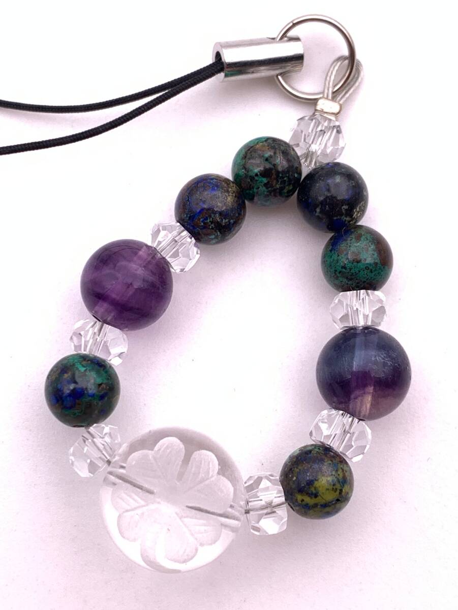 - 天然石彫り水晶四葉のクローバー&アズライト&フローライトのストラップ