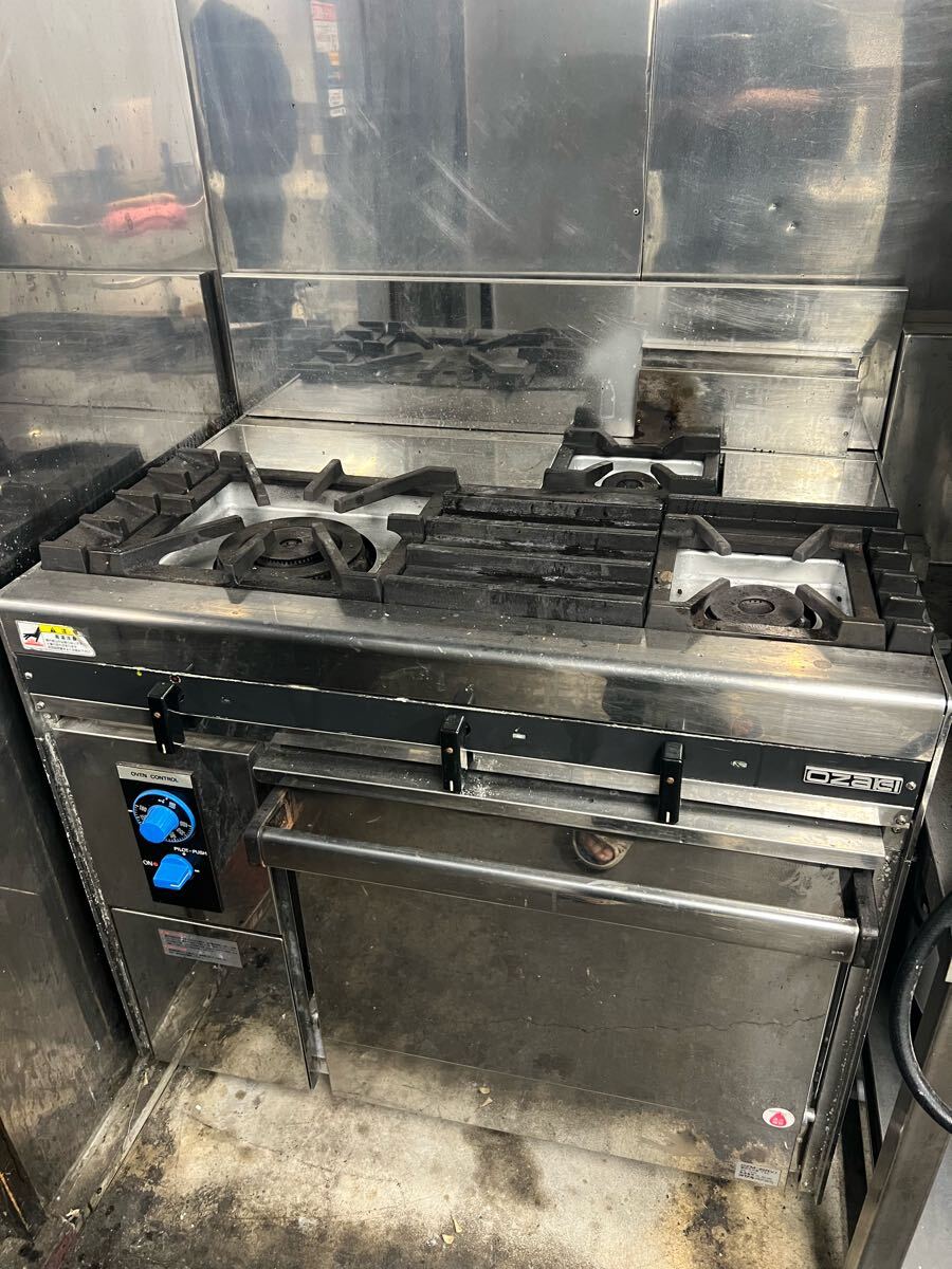 - 千葉 中古 業務用 オザキガステーブル オーブン付 三口 3口 OZM-90RV1 ガスコンロ 都市ガス用 厨房13A タニコー マルゼン