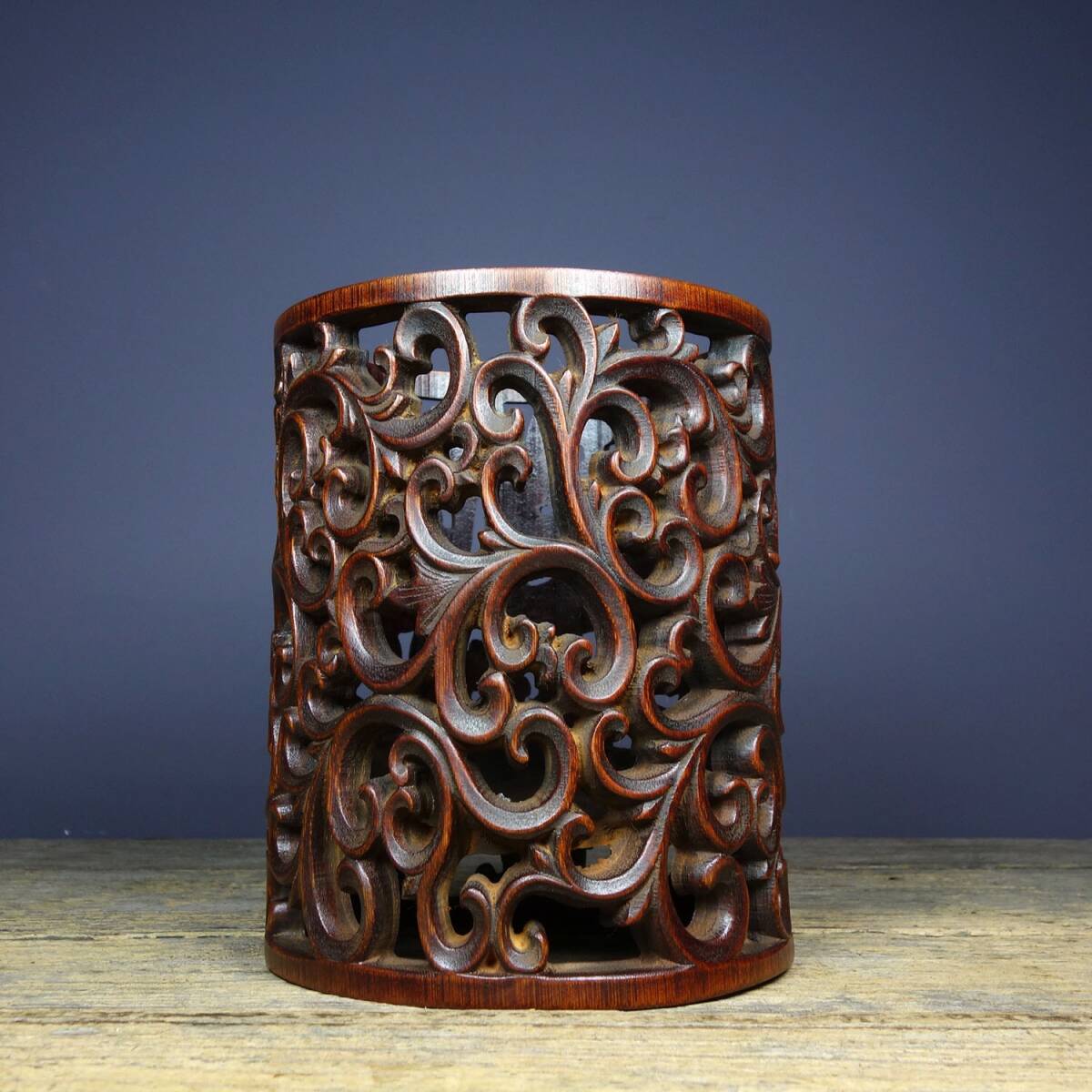 - 【超珍館蔵】竹材細密彫 花草紋 筆筒 置物 賞物 古賞物 古美術品 稀少珍蔵品