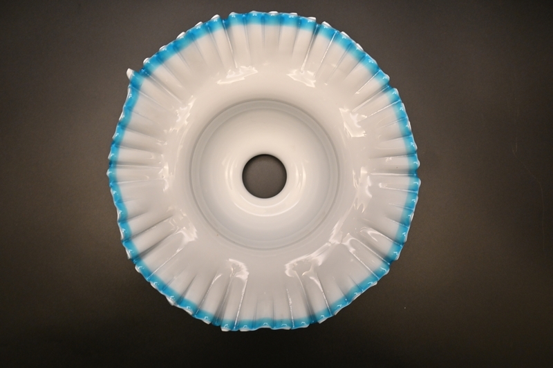 - 電笠 レトロ 大正■ロマン 溢れる 電傘[フリル 乳白色 ミルクガラス] 波型フリル ランプシェード■水色縁 ライトブルー 時代照明 骨董■