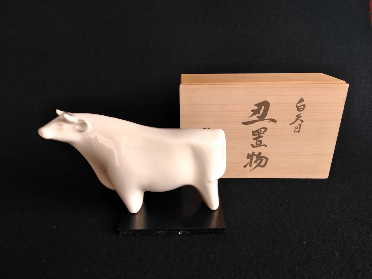 - 白天目 「丑置物」うし 牛 白磁 木箱付き(A-46)