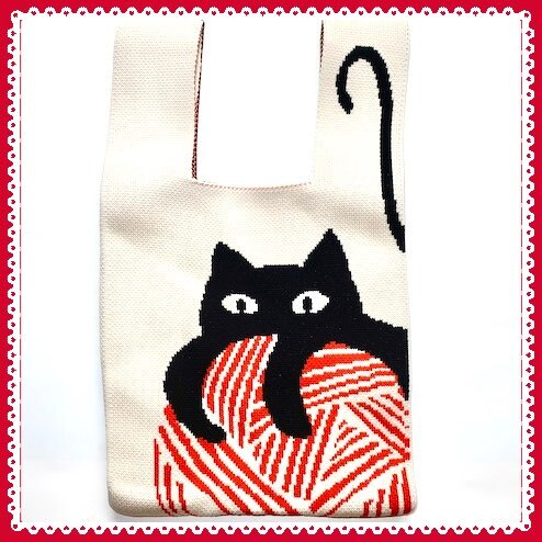 - ● 日本未発売 バッグ ハンドバッグ トートバッグ ミニトート ニットバッグ 猫 しっぽ 新品 コットン 厚手 丈夫 黒猫