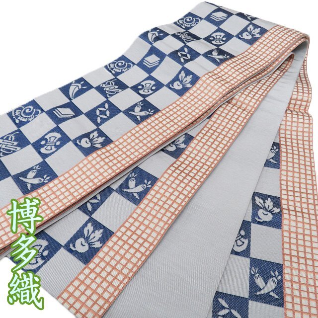 - 半幅帯 中古 リサイクル 正絹 カジュアル 仕立て上がり 博多織 市松取り 宝尽くし 鼠色 紺色 東雲色 きもの北條 A1181-26