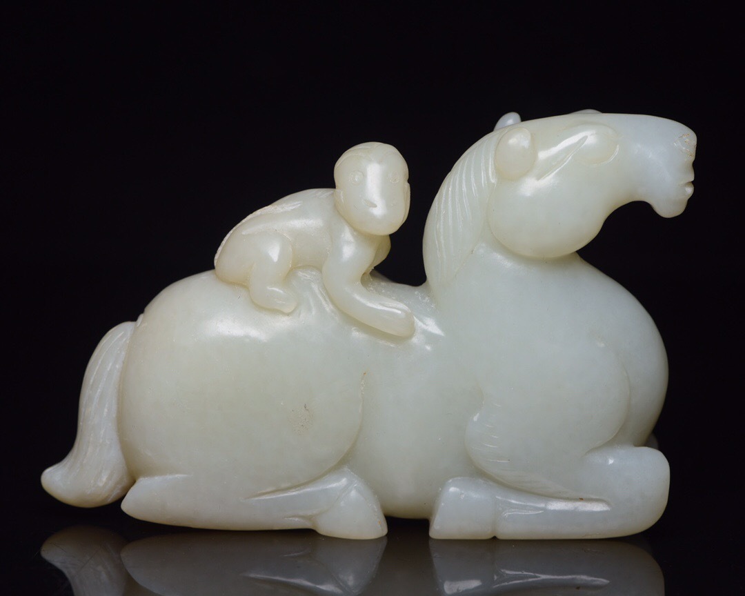 - ▽鴻▽ 和田玉製 細密彫 馬上封侯 置物 古賞物 中国古玩 中国古美術