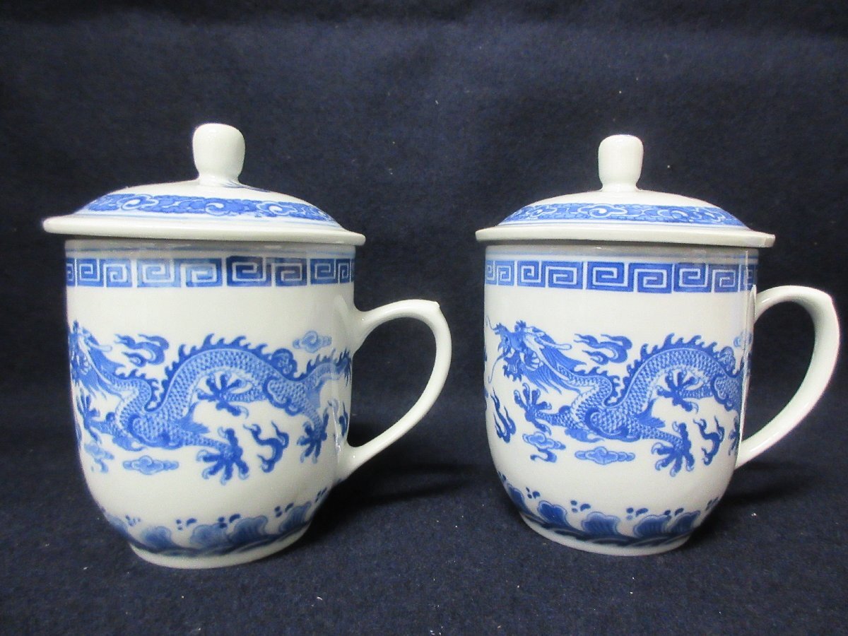 - f 伝統工芸 工芸品 工芸美術 中国 景徳鎮製 景徳鎮 染付 龍文 蓋付 マグカップ 湯呑 コップ ペア 2客 【星見】