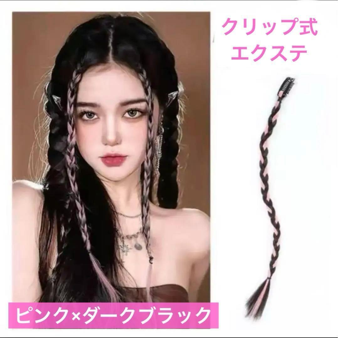 - 【ピンク×ダークブラック】2個セット クリップ式 ブレイドヘアエクステンション