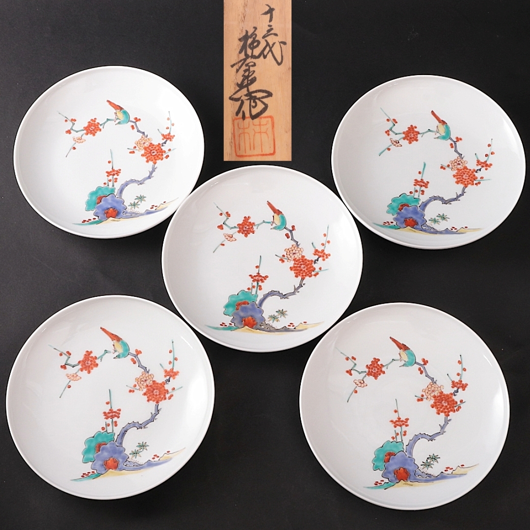> ◆◇十三代 酒井田柿右衛門 錦梅鳥文 皿 5客 共箱 直径約15cm 銘々皿 有田焼◇◆