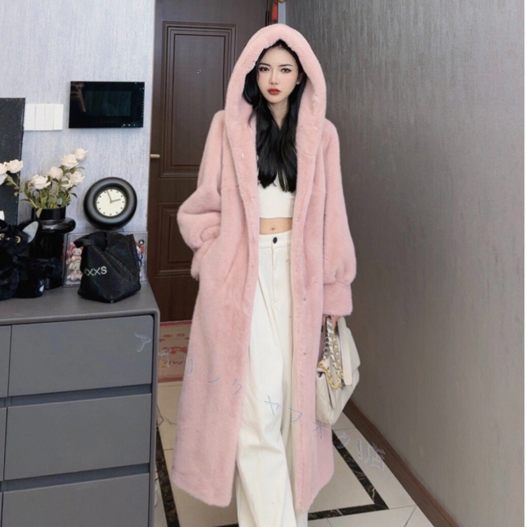 - ロングコート 長袖 羽織 アウター もこもこ フード付き シンプル カジュアル レディース ピンク