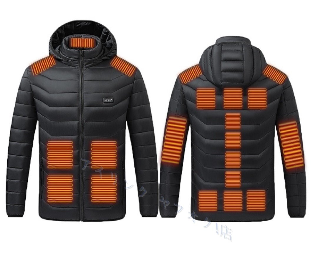 - 電熱中綿ジャケット 加熱/コットンジャケット 21箇所発熱 5秒速暖 USB給電 急速発熱 3段階調温 SIZE:3XL 黒