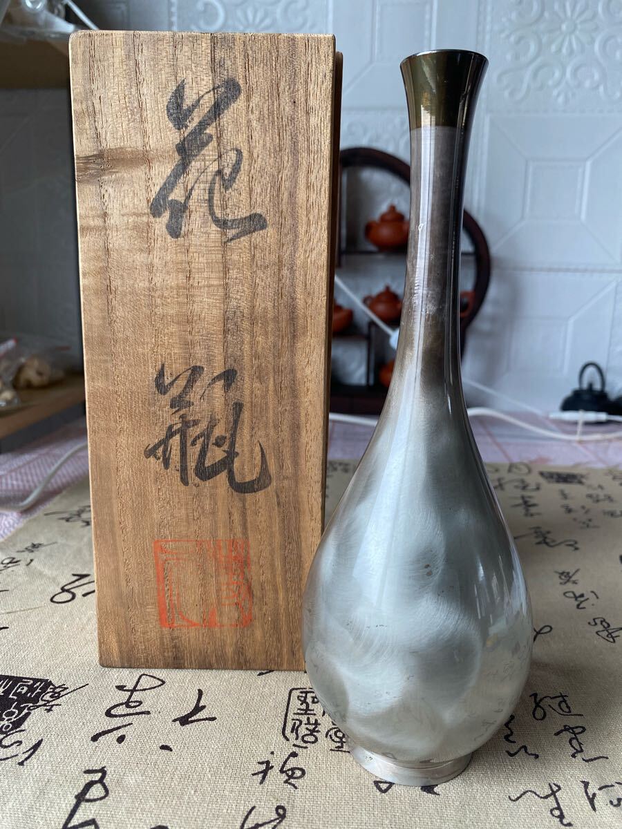 - 花瓶 共箱 鶴首 花器 花生 花入 一輪挿し 置物 華道具 金属製 金属工芸 インテリア