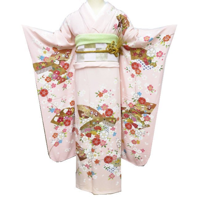 > 振袖 着物 中古 正絹 金駒刺繍 花模様 桜 牡丹 地紙 宝物 縮緬地 乙女色 多色 金 身丈174cm 裄68cm L トール きもの北條 A1184-6