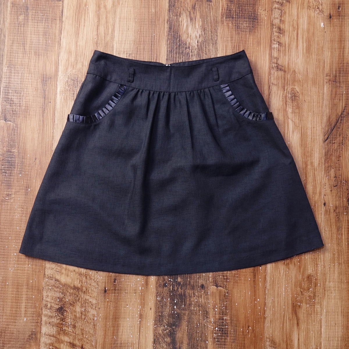 - 美品 フェルテ fuerte Aラインフレアスカート レディース サテンリボン ミニ 裏地付 64 Mサイズ ブラック FR378