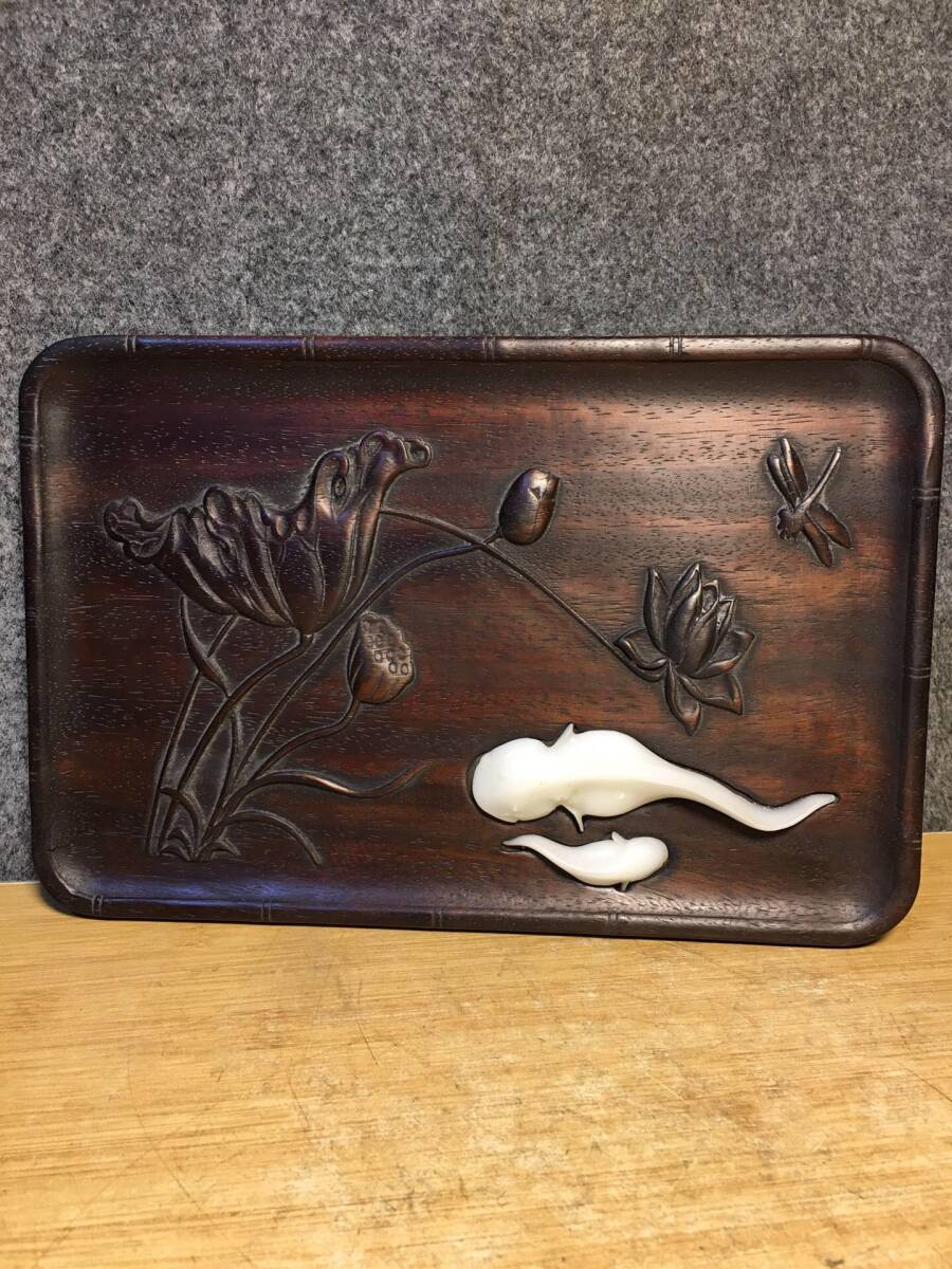 - 【超珍館蔵】紫檀木製 細密彫 嵌玉 茶盤 置物 賞物 古賞物 古美術品 稀少珍蔵品