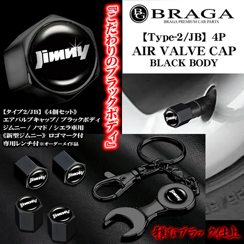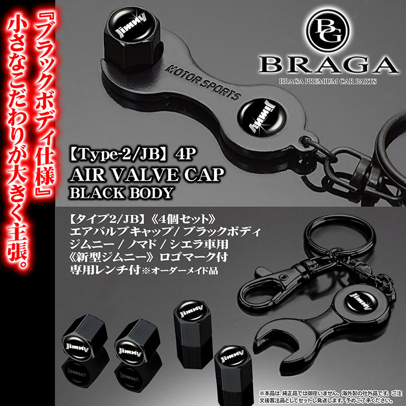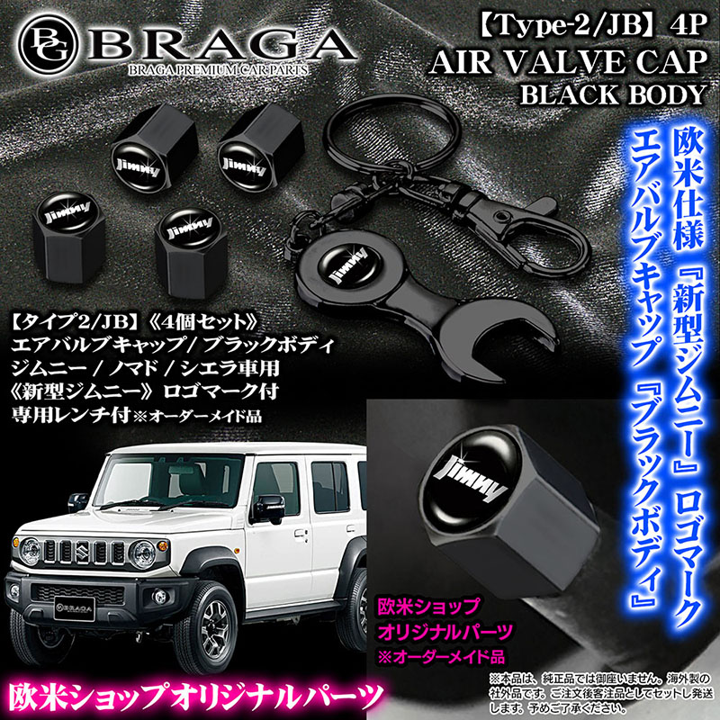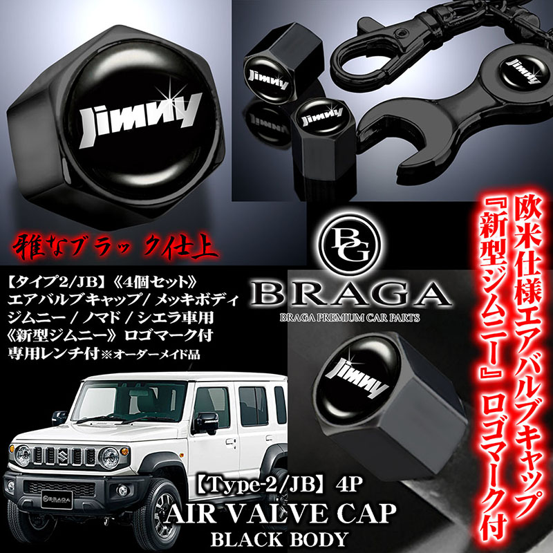 > [タイプ2/JB]エアバルブキャップ/新型ジムニー ロゴマーク付/ジムニー ドマノ車用/客注品/4個入/専用レンチ付 ブラック/ブラガ BG BRAGA