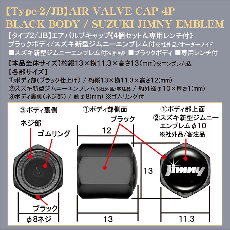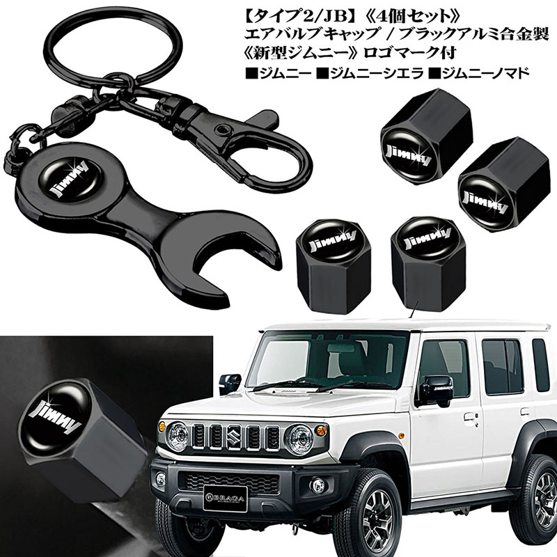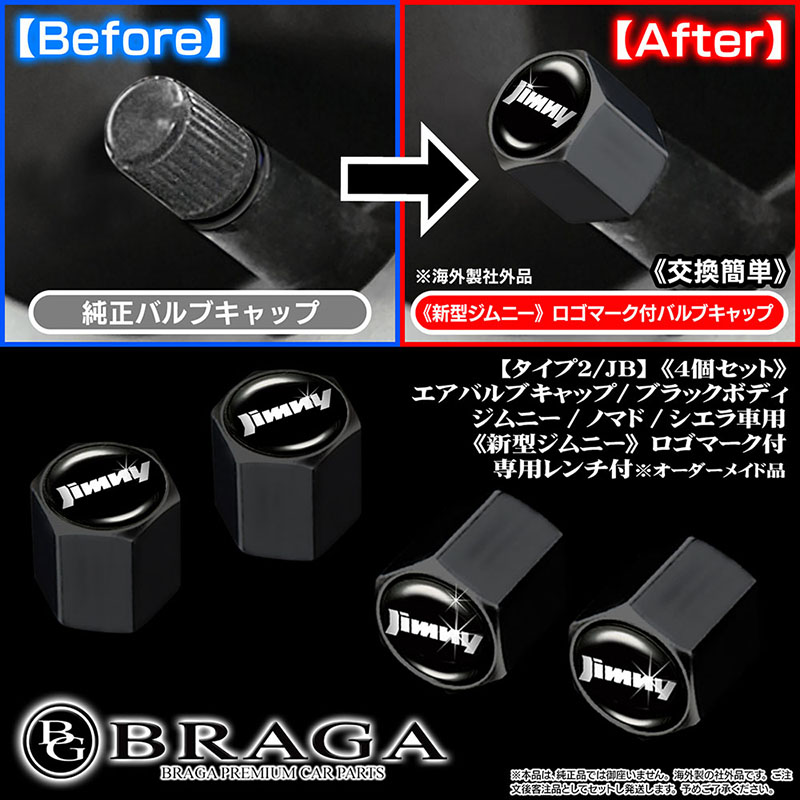- [タイプ2/JB]エアバルブキャップ/新型ジムニー ロゴマーク付/ジムニー ドマノ車用/客注品/4個入/専用レンチ付 ブラック/ブラガ BG BRAGA
