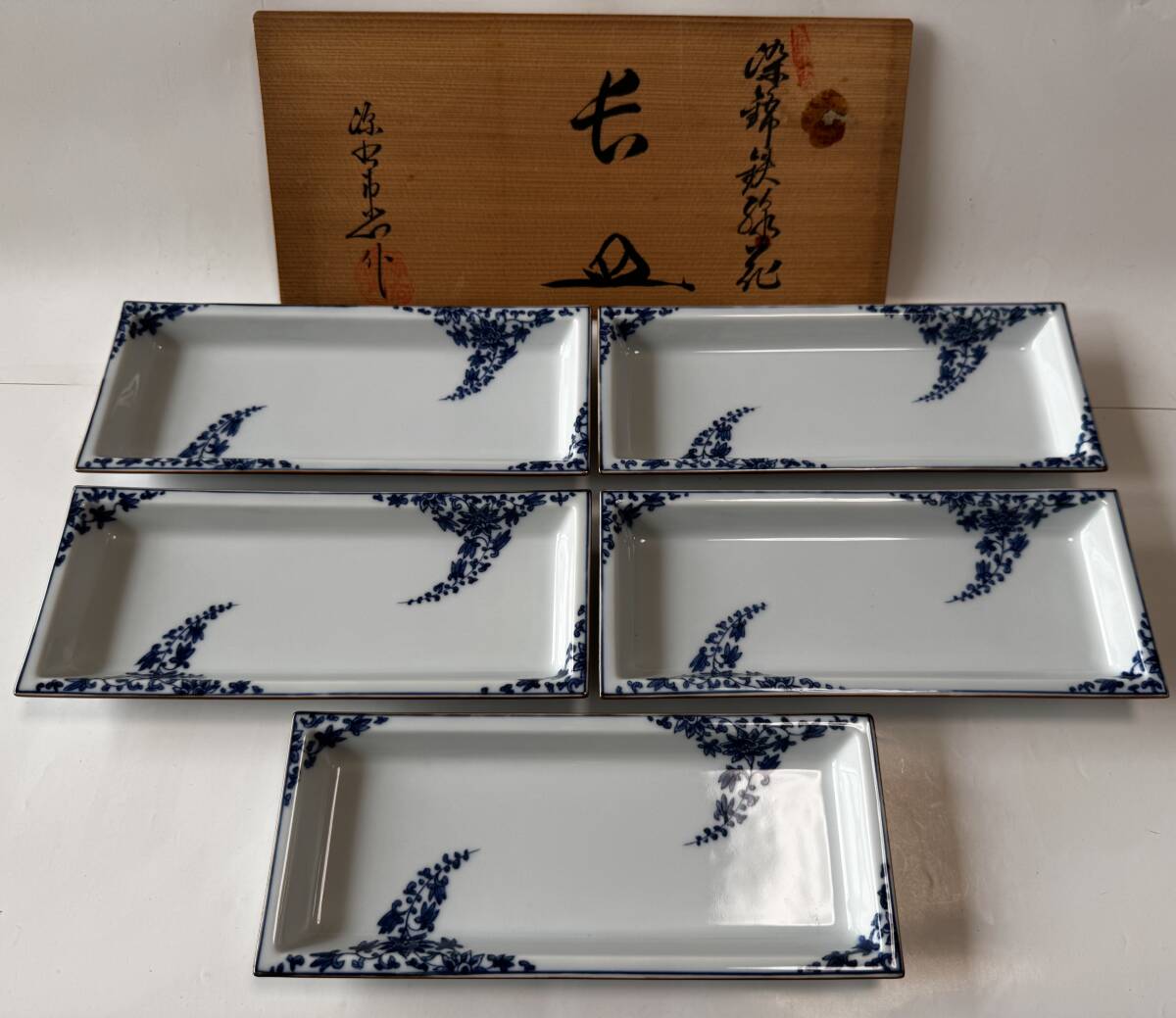 > 有田焼 源右衛門窯 染付け長皿 染付芙蓉絵 長方皿 五枚揃 5枚 角皿 22cm 共箱