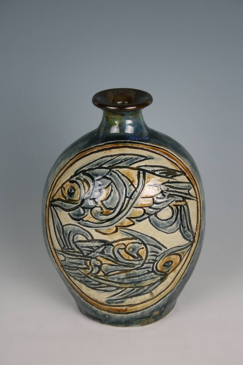 - 壺屋焼 人間国宝 金城次郎 作 呉須窓絵双魚文扁壺