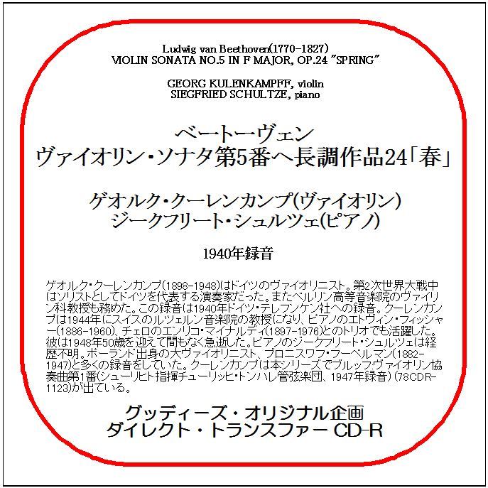 - ベートーヴェン:ヴァイオリン・ソナタ第5番「春」/クーレンカンプ/送料無料/ダイレクト・トランスファー CD-R