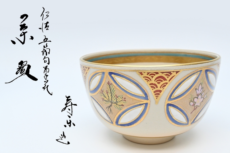 > 寿楽 京焼 茶碗 ■ 色絵七宝 仁清五節句 花 [ 抹茶碗 ] 青海波 裏印 ■ 茶道具 布 共箱 ■