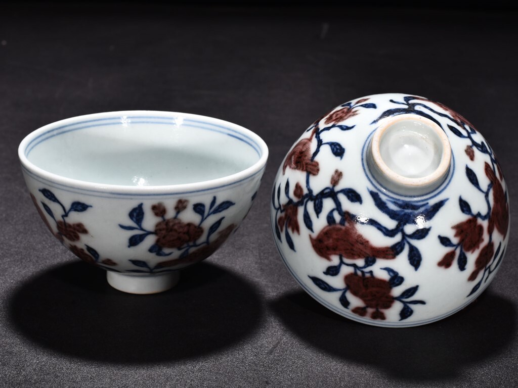 - TA185■中国古玩 唐物 明永楽 青花釉里紅花鳥紋鶏心碗2客 時代物 極上品■