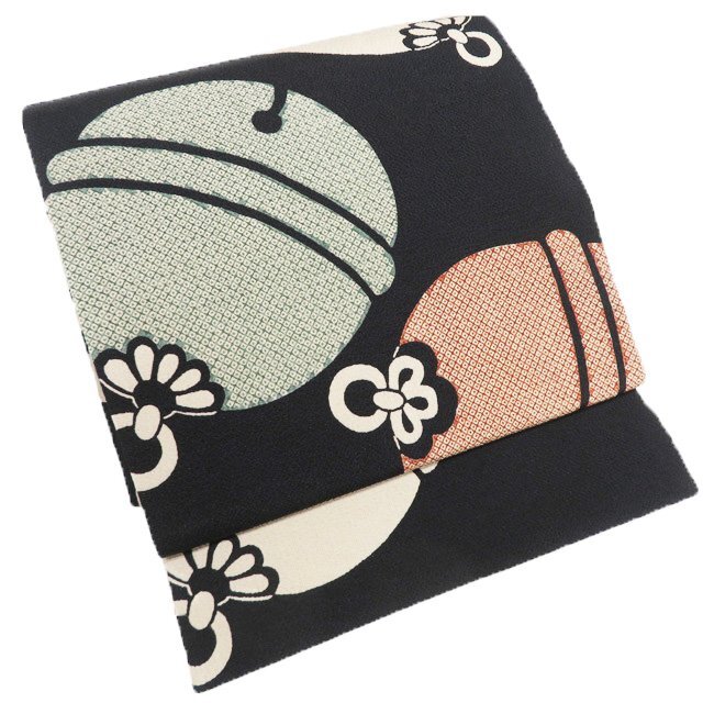 - 特選 開き名古屋帯 なごや帯 中古 リサイクル 正絹 縮緬地 カジュアル 仕立て上がり 鈴模様 黒色 多色 きもの北條 A1188-12