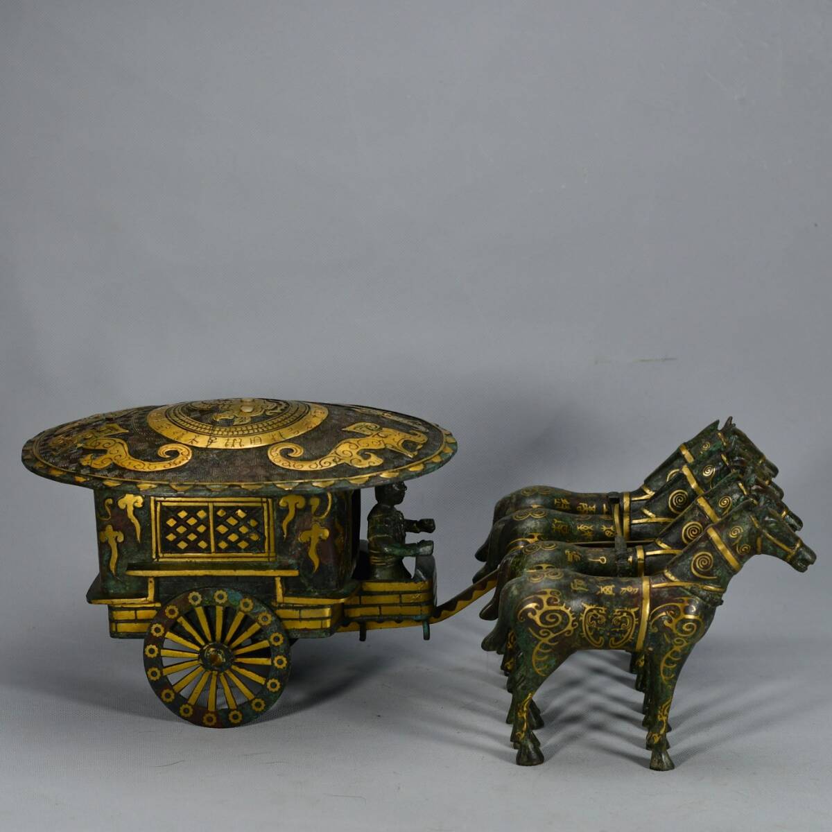 - ◆旧家蔵出◆古美術 戰國時期 古銅製 青銅器 錯金 銘文 馬拉車 細密細工造 置物 擺件 古賞物 骨董 時代物 AT17