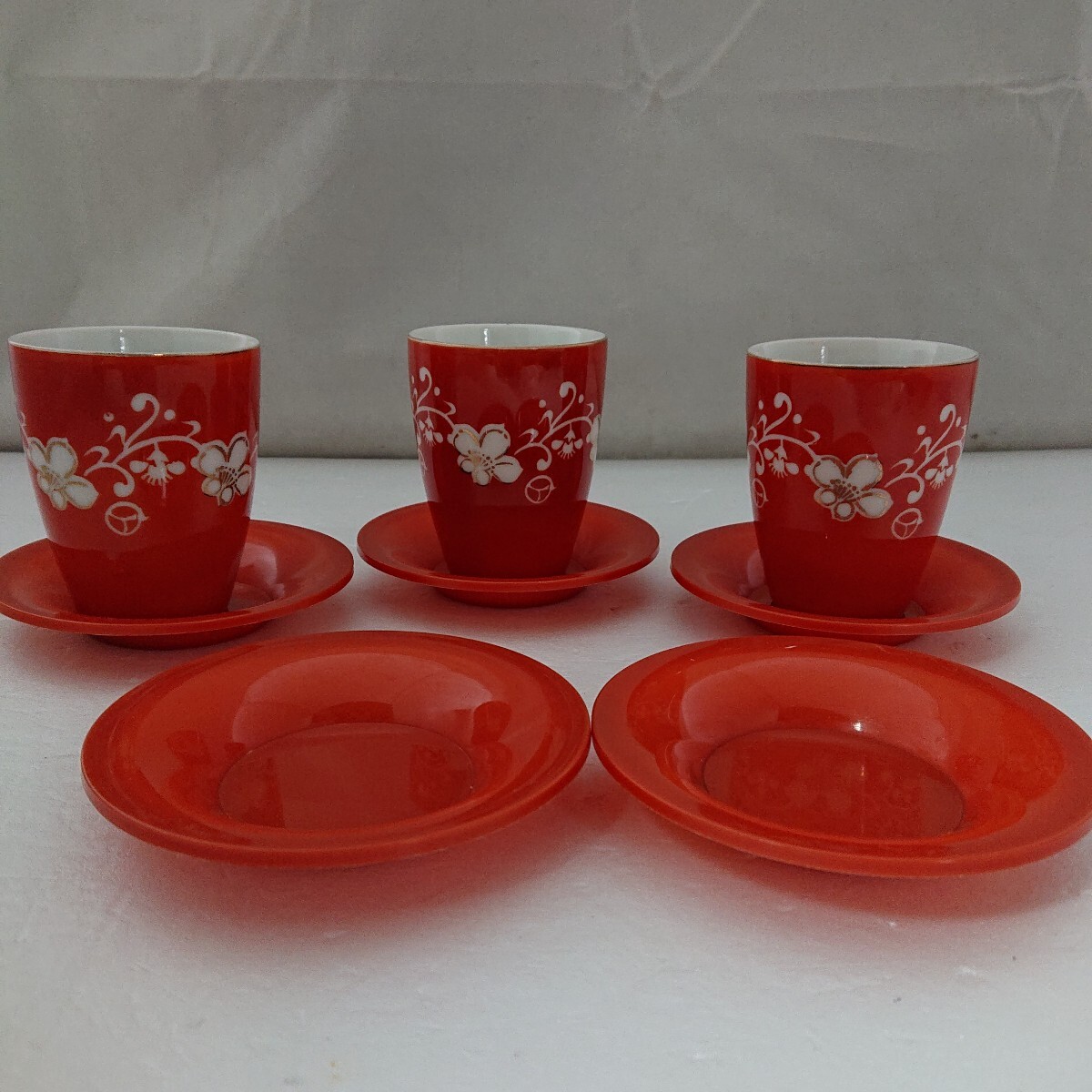 - 【茶器 まとめ売り】 湯呑み3点・茶托5点 箱無し グラス ソーサー和食器 花柄 陶器 昭和レトロ 当時物 現状品 ぷらみ 0509 31