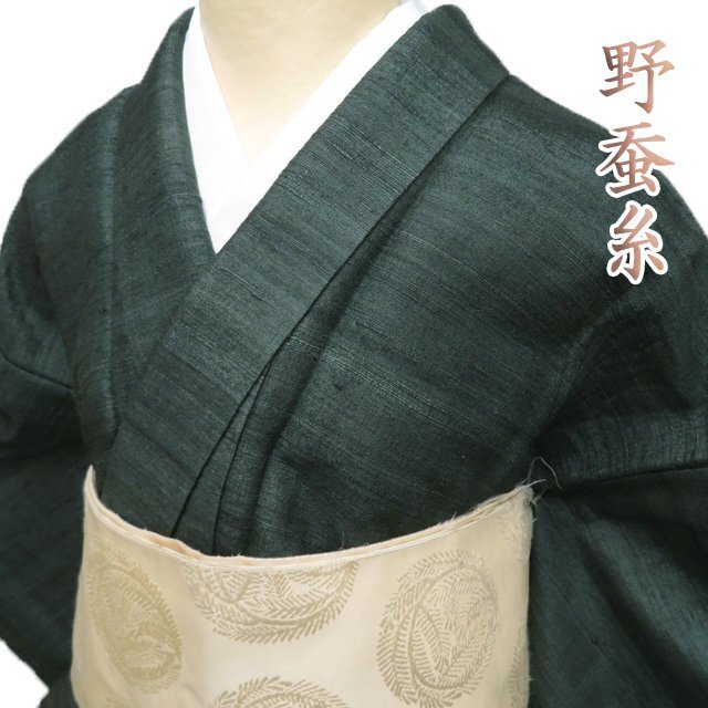 > 特選 野蚕糸 紬地 着物 襦袢 2点セット 中古 正絹 単衣 カジュアル やまと誂製 老緑色 身丈164.5cm 裄68cm L きもの北條 A1189-1