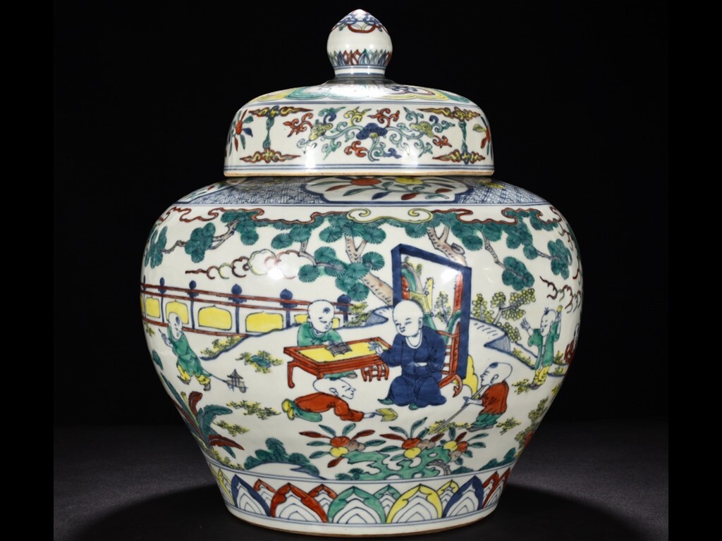 - TA305■中国古玩 唐物 明嘉靖青花五彩庭院嬰戯紋蓋壺 時代物 極上品■