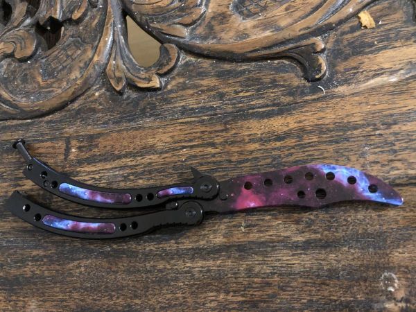- 新品 バタフライナイフ パープル 穴空き 刃無し 練習用