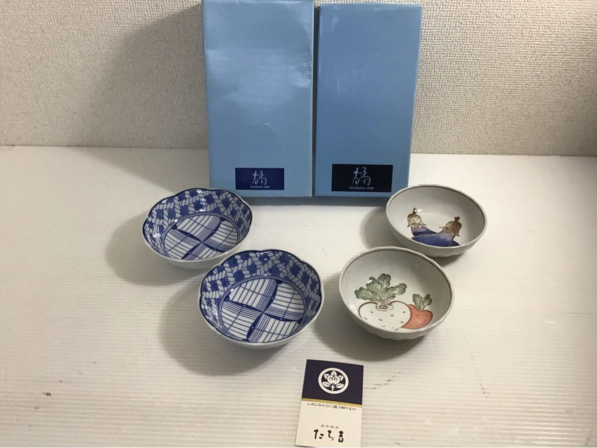 - 未使用? たち吉 小皿4枚セット 野菜絵ペア小鉢 格子文ペアボール 和食器 取り皿 サラダ 煮物