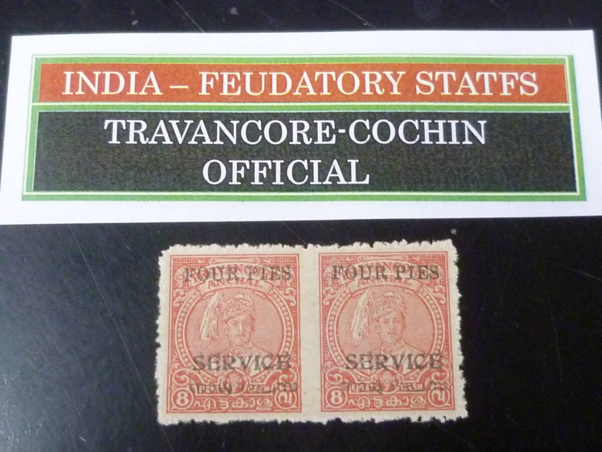 - 25SE M №88 インド切手 TRAVANCORE - COCHIN 1949年 公用 SC#O12 中間無目打 横ペア 4p/8ca 未使用LH