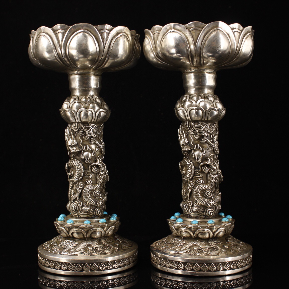 - ▽鴻▽ 銅製 銀鍍 寶石嵌 盤龍ろうそくだい一對 置物 賞物 古賞物 中国古玩 中国古美術