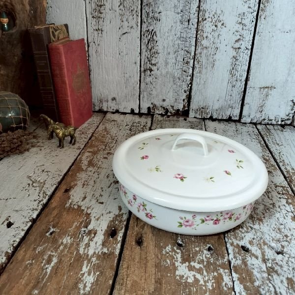 - ヴィンテージ 未使用 ホーロー 蓋付 保存容器 琺瑯 鉢 ボウル フラワー 小花 常備菜 作り置き ビンテージ アンティーク レトロ 古道具