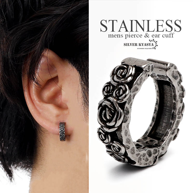 - ステンレス バラ イヤーカフ 薔薇 花 ワンタッチ 開閉式 メンズ ピアス シルバー イヤカフ 金属アレルギー対応 片耳用 1点