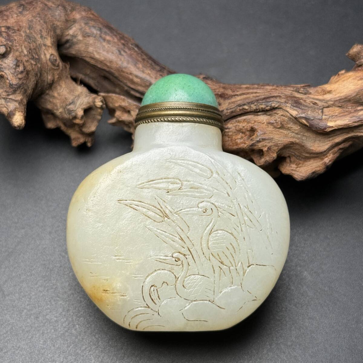 - 古玉彫 旧蔵 清 和田玉 鼻煙壺【一品仙鶴】 細密細工 時代物 古置物 古賞物 中国古美術 中國文玩 S75