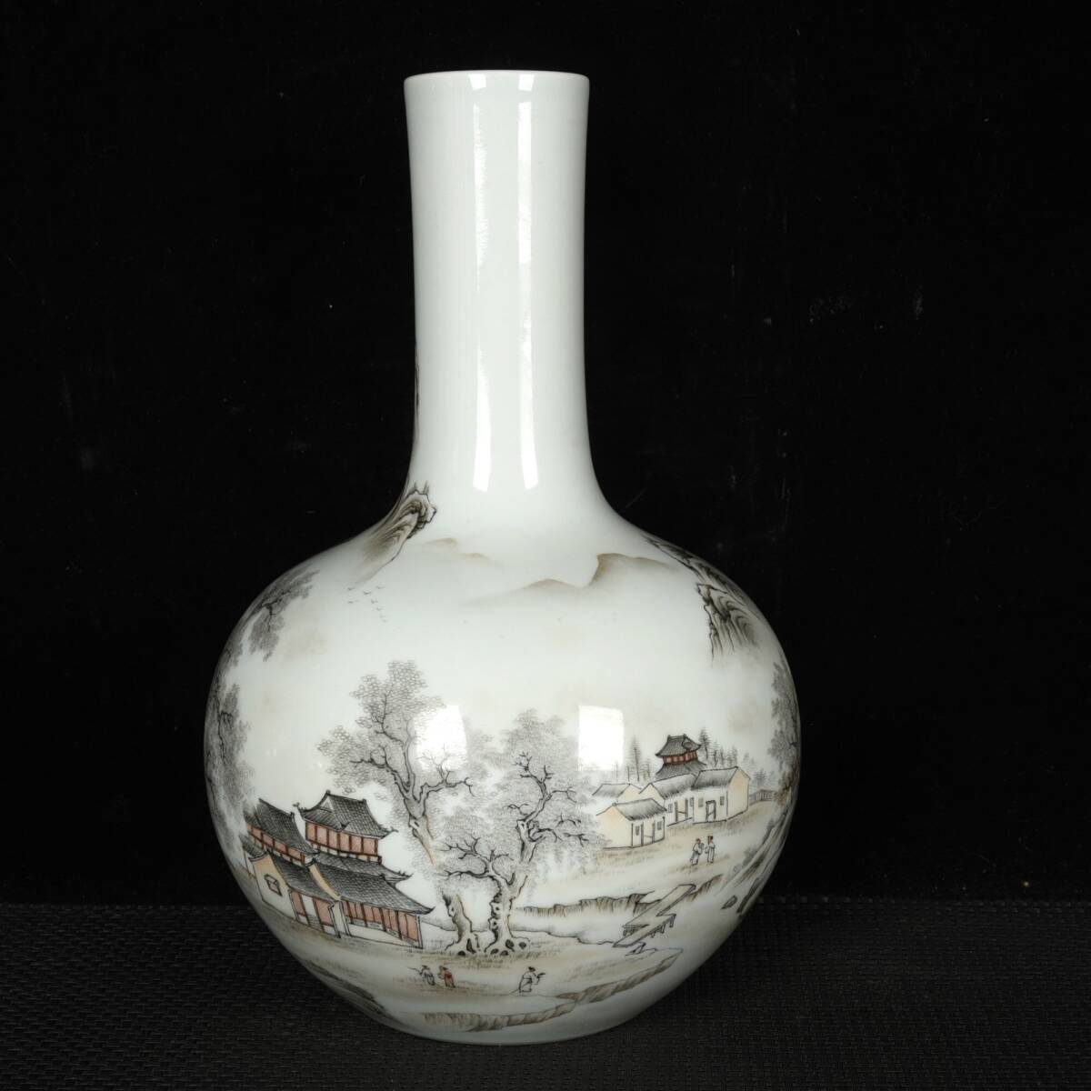 - 【仁】『清・乾隆年製款・古陶瓷品・墨彩・山水紋・天球瓶・陶藝』極細工 古賞物 古董品 中国古玩 古美術 古美味 時代物 旧家蔵出